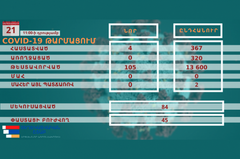 Առայսօր, COVID-19-ը ախտորոշվել է 367 մարդու մոտ, որից 320-ը հաղթահարել է հիվանդությունը: Փաստացի բուժում է ստանում 45, ընդհանուր մեկուսացված է 84 քաղաքացի: