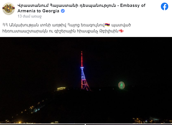 ՔԱՂԱՔԱԿԱՆՎրաստանում ՀՀ դեսպանության նախաձեռնությամբ երրորդ տարին անընդմեջ Թբիլիսիի հեռուստաաշտարակը լուսավորվել է Հայաստանի Հանրապետության դրոշի գույներով։ Այս մասին տեղեկացրին Վրաստանում ՀՀ դեսպանությունից։