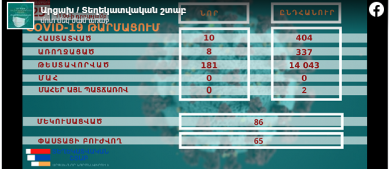 Առայսօր, COVID-19-ը ախտորոշվել է 404 մարդու մոտ, որից 337-ը հաղթահարել է հիվանդությունը: Փաստացի բուժում է ստանում 65, ընդհանուր մեկուսացված է 86 քաղաքացի: