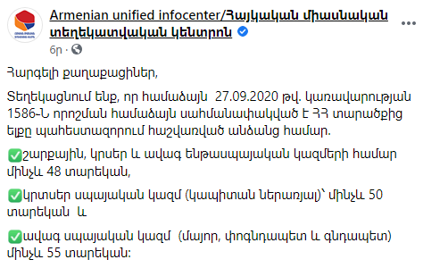 Տեղեկացնում ենք, որ համաձայն 27.09.2020 թվ. կառավարության 1586֊Ն որոշման համաձայն սահմանափակված է ՀՀ տարածքից ելքը պահեստազորում հաշվառված անձանց համար.