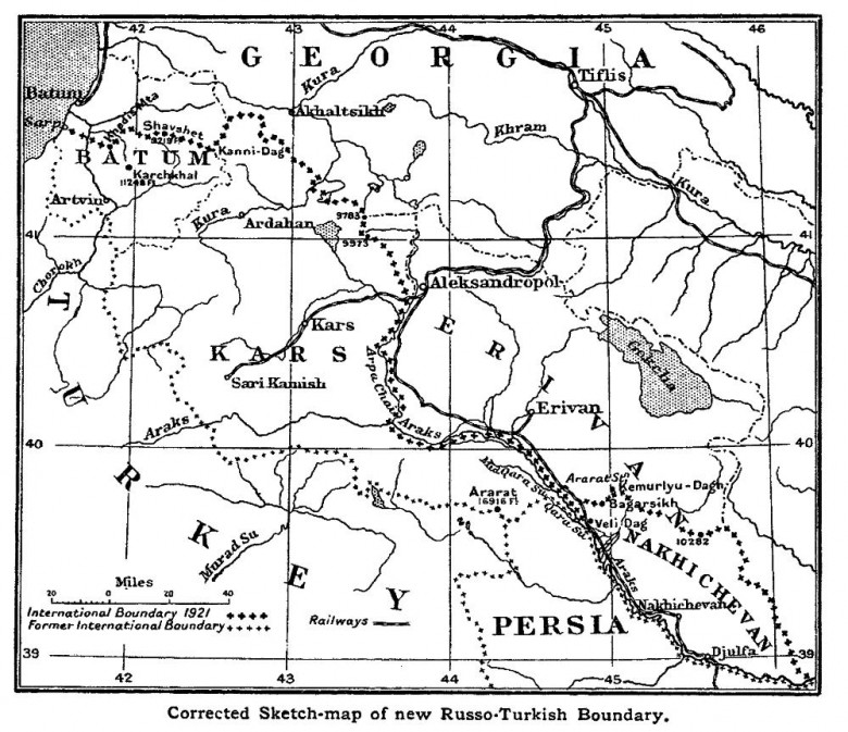 1921– կնքվել է Կարսի պայմանագիրը Խորհրդային Հայաստանի, Խորհրդային Վրաստանի, Խորհրդային Ադրբեջանի և Թուրքիայի միջև, որով Հայաստանի տարածքներից Թուրքիային են անցել գրեթե ամբողջ Կարսի մարզը և Սուրմալուի գավառը՝ ներառյալ Արարատ լեռն իր հարակից շրջաններով, իսկ Ադրբեջանին՝ Նախիջևանի շրջանը, որը սահմանվել է որպես ինքնավար կազմավորում: