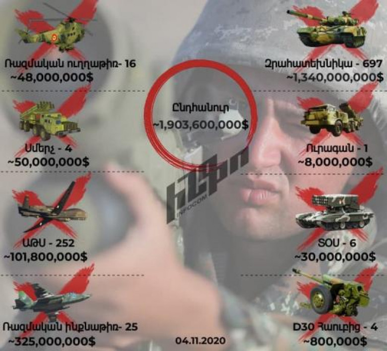 ՀԱՍԱՐԱԿՈՒԹՅՈՒՆՆոյեմբերի 4-ի դրությամբ՝ Ադրբեջանն արդեն կրել է 1,903,600,000,դոլարի կորուստ: Infocom-ը ներկայացնում է Ադրբեջանի կորուստները՝ դրամական արտահայտությամբ։