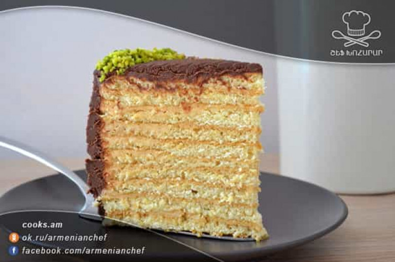 - Պատրաստի տորթը տեղափոխում ենք սառնարան 24 ժամով, ապա հանում ենք, կտրում և մատուցում այն: