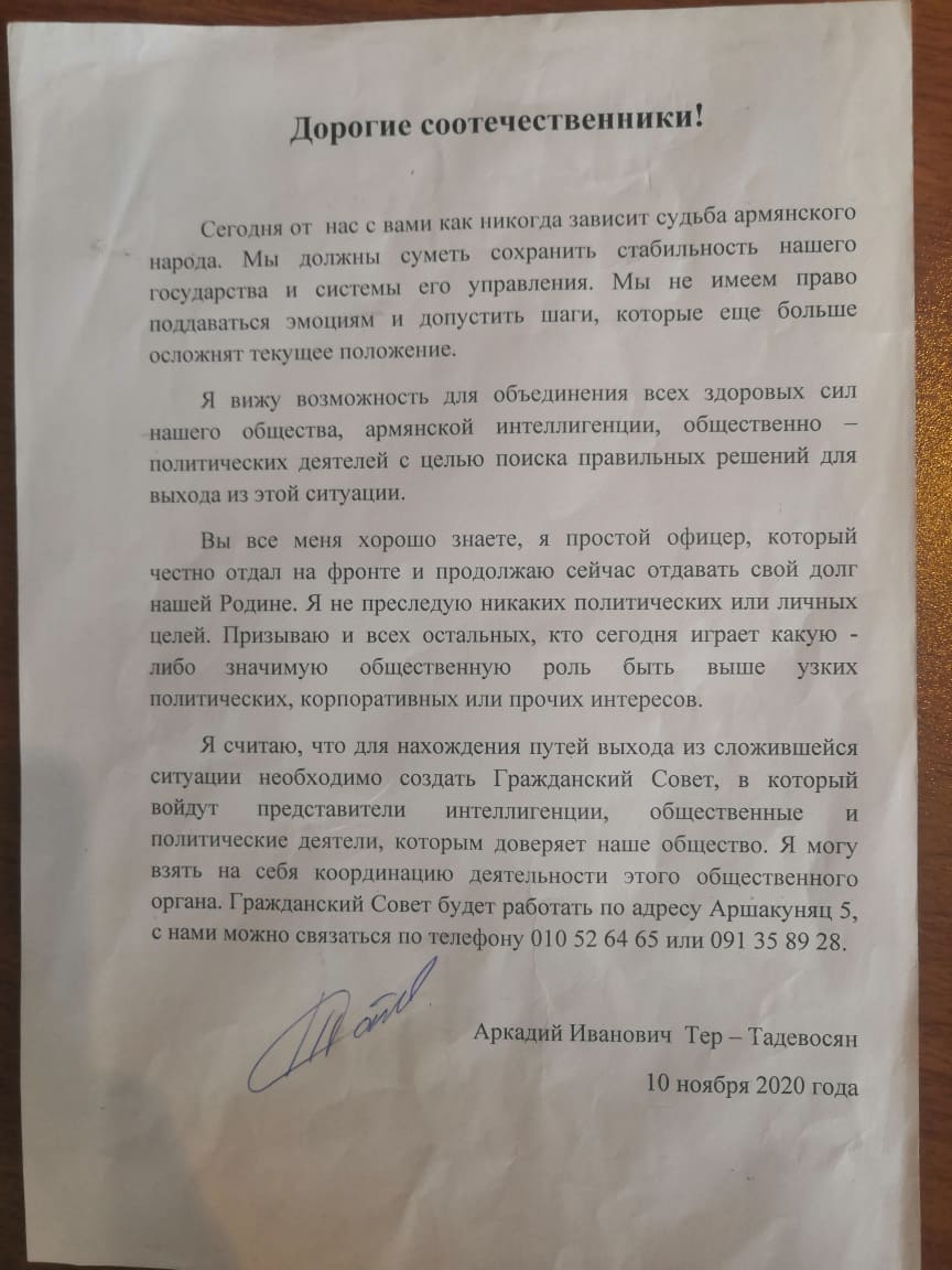 Կարծում եմ, որ այս իրավիճակից ելքեր գտնելու համար անհրաժեշտ է ստեղծել Քաղաքացիական խորհուրդ, որում ընդգրկված կլինեն մտավորականության ներկայացուցիչներ, հասարակական քաղաքական գործիչներ, որոնց վստահում է մեր հասարակությունը: Ես կարող եմ ստանձնել այս հասարակական մարմնի գործունեության համակարգումը: Քաղաքացիական խորհուրդը կաշխատի Արշակունյաց 5 հասցեում, կարող եք կապվել մեզ հետ 010 52 6465 կամ 091 35 8928 հեռախոսահամարներով: