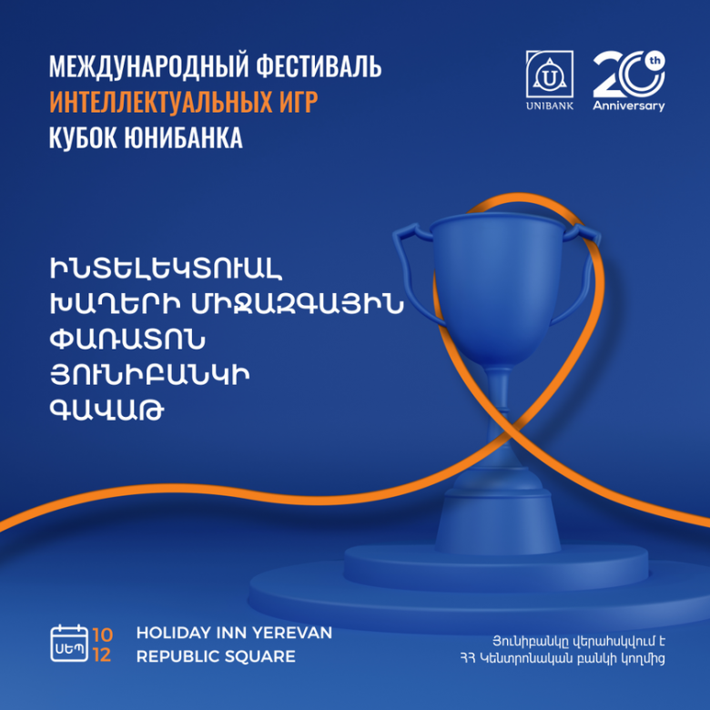 ՀԱՍԱՐԱԿՈՒԹՅՈՒՆՍեպտեմբերի 10-12-ը Երևանում կկայանա «Յունիբանկի գավաթ» ինտելեկտուալ խաղերի միջազգային փառատոն: Միջոցառումը նվիրված է Յունիբանկի գործունեության 20-ամյակին: Բանկը հանդես է գալիս որպես գլխավոր հովանավոր: