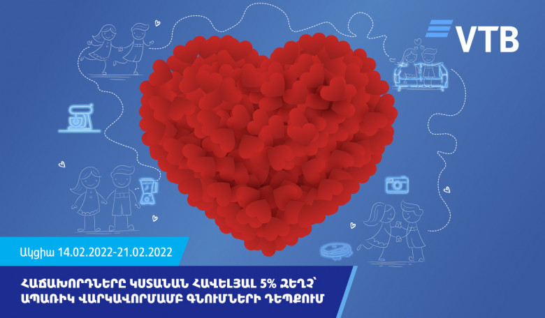 ՀԱՍԱՐԱԿՈՒԹՅՈՒՆՄինչև փետրվարի 21-ը ՎՏԲ-Հայաստան Բանկի գործընկեր կազմակերպությունների վաճառակետերում ապառիկ վարկավորմամբ գնումներ կատարելու դեպքում հաճախորդները կստանան զեղչ: Զեղչը կկազմի վարկի գումարի 5%-ը: