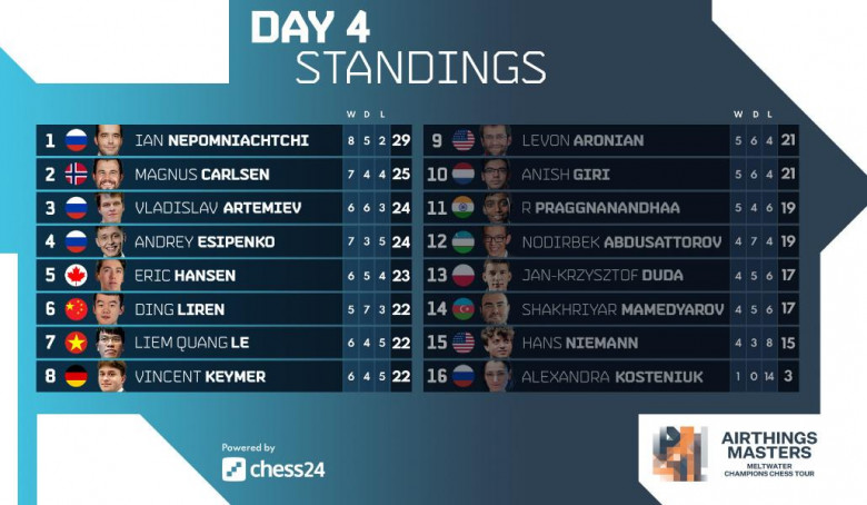 Մեր հավաքականի նախկին առաջատարը 45 հնարավորից (հաղթանակի համար տրվում էր 3, ոչ-ոքու համար` 1 միավոր) վաստակեց 21 միավոր և զբաղեցրեց 9-րդ տեղը: Խմբային փուլի հաղթող դարձավ ռուսաստանցի Յան Նեպոմնյաշչին, որը վաստակեց 29 միավոր: Գլխավոր մրցանակի համար պայքարը փլեյ-օֆֆում կշարունակեն առաջին ութ տեղերը գրաված շախմատիստները: