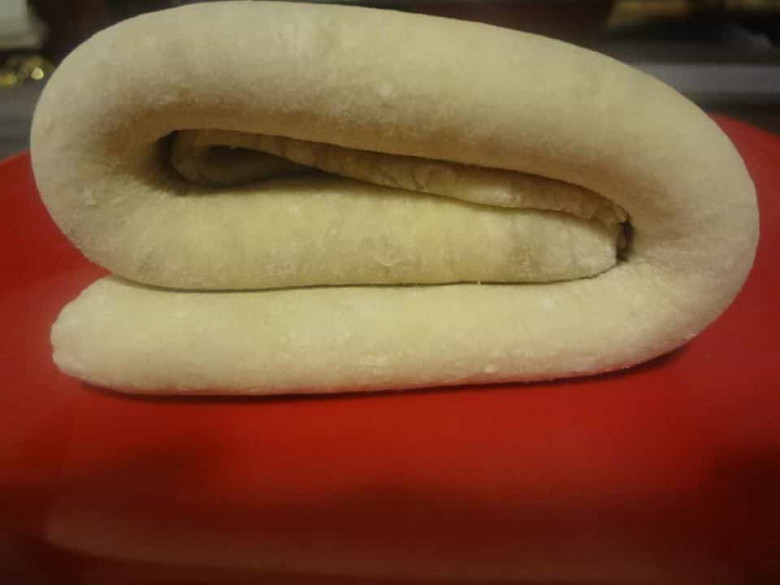 Ինչպես նաև շարելուց շարել այնպես, որ խմորի միացման մասը մնա տակը։ Թողնել 30 րոպե, որպեսզի խմորը հանգստանա։ Այնուհետև խմորները գրտնակով բացել, ծալել և դնել սառնարանում։ Նույն գործողությունը կատարել 3 անգամ (գրտնակել, ծալել, փակել և դնել սառնարան), ամեն անգամ սառնարանում թողնելով 45-60 րոպե։