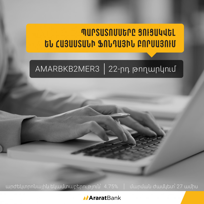 ՀԱՍԱՐԱԿՈՒԹՅՈՒՆԱրարատԲանկը տեղեկացնում է, որ պարտատոմսերի (AMARBKB2MER3) անվանական արժեքը 25 ԱՄՆ դոլար է, արժեկտրոնային եկամտաբերությունը` 4․75%, իսկ մարման ժամկետը՝ 27 ամիս։