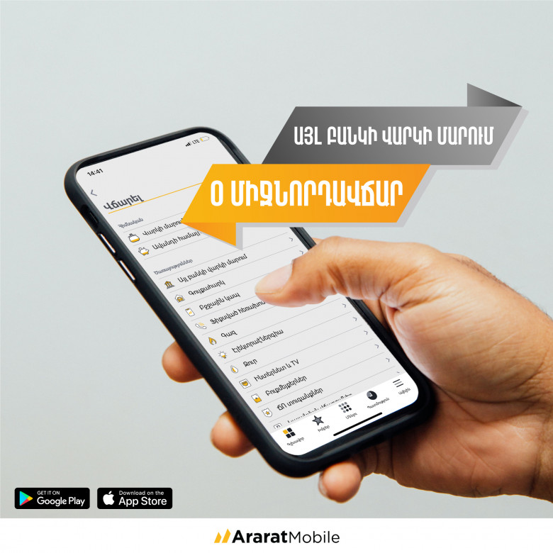 ՀԱՍԱՐԱԿՈՒԹՅՈՒՆԱրարատՄոբայլ հավելվածում արդեն հասանելի է «Այլ բանկի վարկի մարում» ծառայությունը։ ԱրարատՄոբայլ հավելվածի օգտատերերը կարող են այլ բանկերում իրենց վարկային պարտավորություննրը մարել հավելվածի միջոցով։