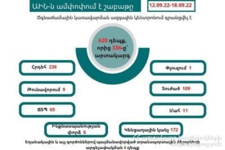 Սեպտեմբերի 12-ից 18-ն ԱԻՆ ՓԾ ճգնաժամային կառավարման ազգային կենտրոնում գրանցվել է 620 դեպք, որից 336-ը արտակարգ, այդ թվում՝ 236 հրդեհի, 1 փլուզման, 6 ինքնասպանության փորձի դեպք, 65 ճանապարհատրանսպորտային պատահար, ինչպես նաև՝ 172 կենցաղային կանչ. տուժել է 109 մարդ։