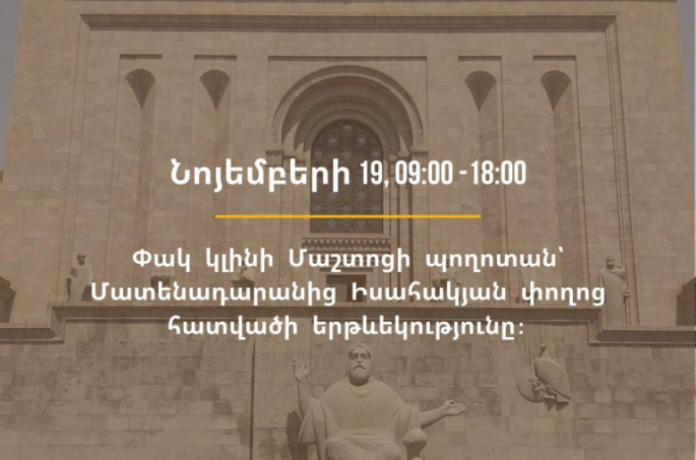 Մայրաքաղաքի ամանորյա տոնական ձևավորման աշխատանքներով պայմանավորված՝ նոյեմբերի 19-ին ժամը 09:00-ից մինչև 18:00-ն, փակ կլինի Մաշտոցի պողոտան՝ Մատենադարանից Իսահակյան փողոց ընկած հատվածի երթևեկությունը: