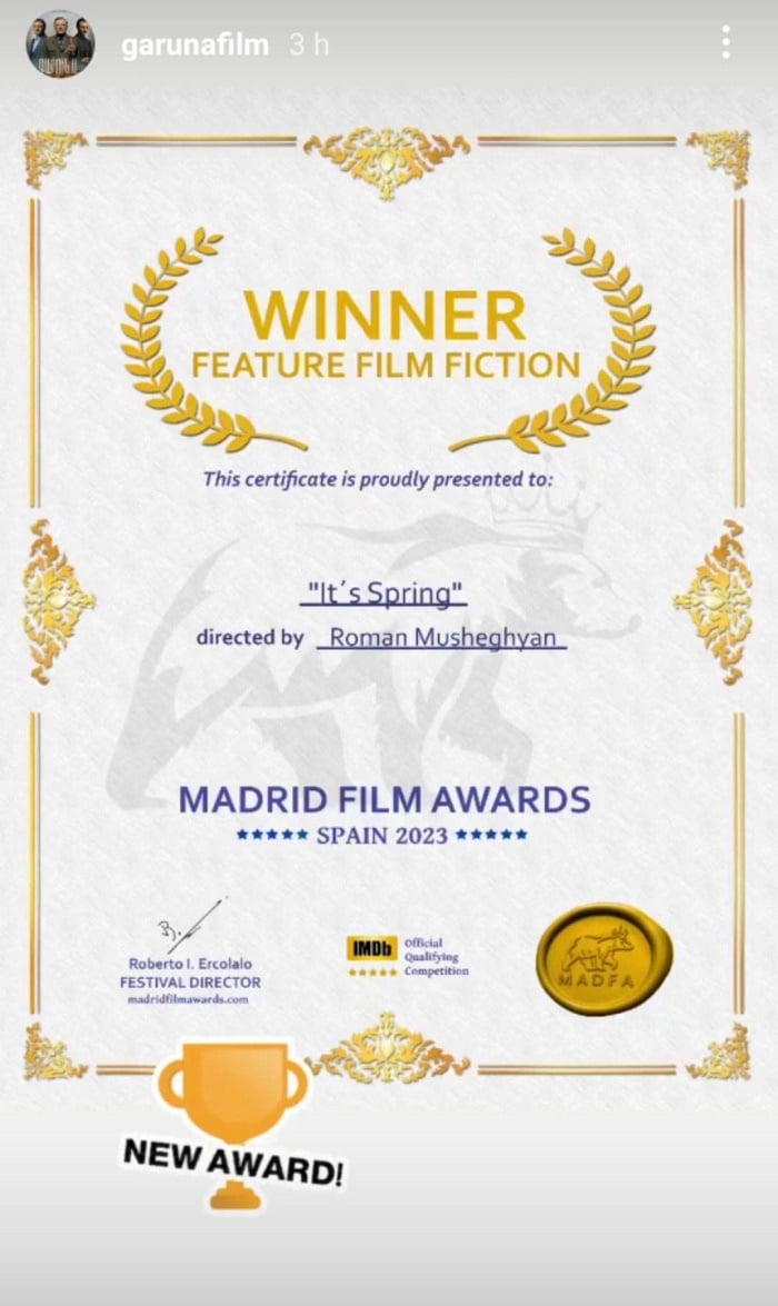 «Լավագույն գեղարվեստական ֆիլմ», «Լավագույն ռեժիսոր»․ «Գարուն ա» ֆիլմը՝ Մադրիդի կինոփառատոնին (լուսանկարներ)
