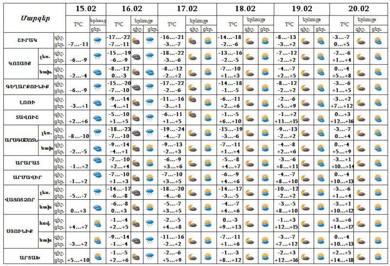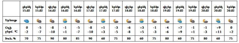 Փետրվարի 15-ի ցերեկը, 16-ին առանձին շրջաններում սպասվում է թույլ ձյուն, լեռնային գոտիներում՝ բուք։ Փետրվարի 17-20-ը սպասվում է առանց տեղումների եղանակ: