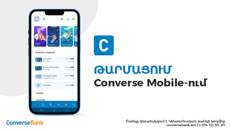 ՀԱՍԱՐԱԿՈՒԹՅՈՒՆConverse Mobile-ի զարգացման ծրագրի շրջանակում Կոնվերս Բանկը ներկայացրել է նոր, թարմացված Հավելվածը՝ ավելի ֆունկցիոնալ ու գրավիչ ինտերֆեյսով:
