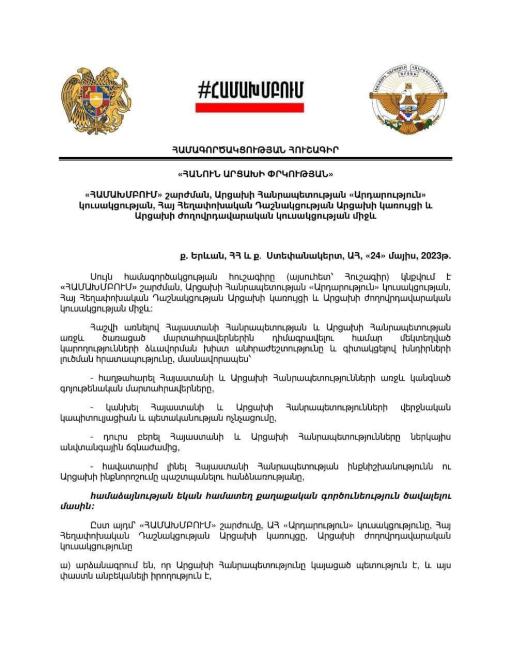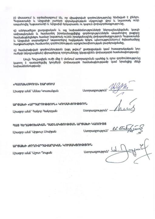 Երևանում և Ստեփանակերտում ստորագրվել է «Հանուն Արցախի փրկության» համագործակցության հուշագիր «ՀԱՄԱԽՄԲՈՒՄ» շարժման, Արցախի Հանրապետության «Արդարություն» կուսակցության, Հայ Հեղափոխական Դաշնակցության Արցախի կառույցի և Արցախի ժողովրդավարական կուսակցության միջև։