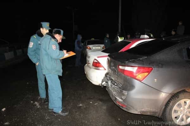 Պարզվել է, որ դեռեւս չբացահայտված հանգամանքներում բախվել են «Կիա Ռիո» մանկիշի (վարորդ`1991թ ծնված Վ. Ջ.) 045ՏՏ60 պ/հ, «ՎԻՊ» տաքսի ծառայությանը պատկանող «Նիսան Սանի» մակնիշի (վարորդ` 1968թ. ծնված Հ. Ա՚) 651 LS 68 պետհամարանիշի, «Նանա» տաքսի ծառայությանը պատկանող «Դեյվու» մակնիշի (վարորդ` 1987թ. ծնված Կ. Գ.) 085 OP 61 պետհամարանիշի եւ «Մերսեդես E320» մակնիշի (վարորդ` 1990թ. ծնված Ա. Մ.) 34 CT 412 ավտոմեքենաները. տուժածներ չկան: