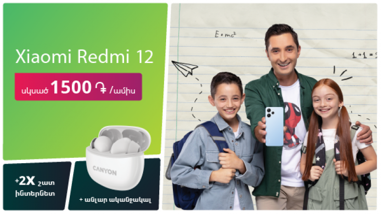 ՀԱՍԱՐԱԿՈՒԹՅՈՒՆՈւսումնական տարվա մեկնարկին, մինչև սեպտեմբերի 30-ը «Յուքոմ» ընկերությունն առաջարկում է ձեռք բերել Xiaomi Redmi 12 սմարթֆոնն անհավանական պայմաններով՝ ամսական ընդամենը 1500 դրամով և ստանալ Canyon TWS-5 անլար ականջակալ ու 2 անգամ շատ ինտերնետ ամբողջ ուսումնական տարվա համար, գեղեցիկ հեռախոսահամար ու Level Up 1800 փաթեթից 1 ամիս անվճար օգտվելու հնարավորություն։ Ինտերնետի կրկնակի՝ 12 ԳԲ ծավալի առաջարկը գործում է Level Up 1800 կանխավճարային սակագնային պլանով, մինչև 2024թ․մայիսի 31-ը։