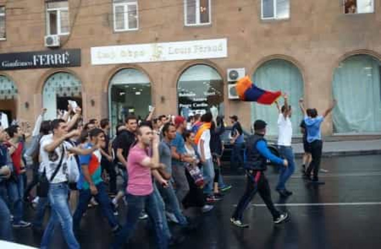 Երթի մասնակիցները վանկարկում են «Միացի՛ր», «Չեղարկո՛ւմ», «Ո՛չ լույսի թանկացմանը» եւ բարձրախոսով քաղաքացիներին հորդորում են միանալ Բաղրամյան պողոտայի նստացույցին: