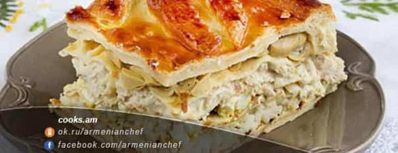Ծածկում ենք խաշած ձվի շերտը 2-3 նրբաբլիթով, ապա վրան լցնում ենք հավի միսը սոուսի հետ ու կրկին ծածկում 2-3 նրբաբլիթով: Ապա վրան լցնում ենք տապակած բանջարեղենները, վրան ծածկում 2-3 նրբաբլիթով և փակում ենք կարկանդակը խմորի փոքր մասով:
