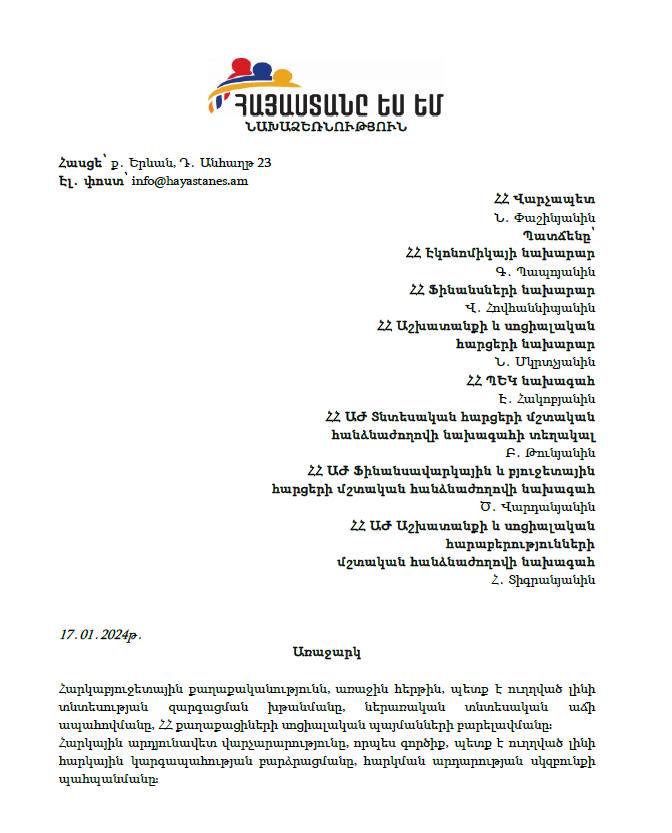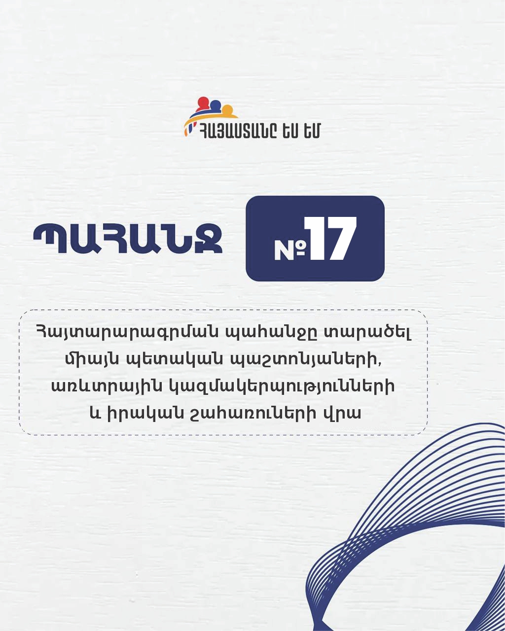 Հայտարարագրման պահանջը տարածել՝ պետական պաշտոնյաների, առևտրային կազմակերպությունների և իրական շահառուների վրա. «Հայաստանը ես եմ»