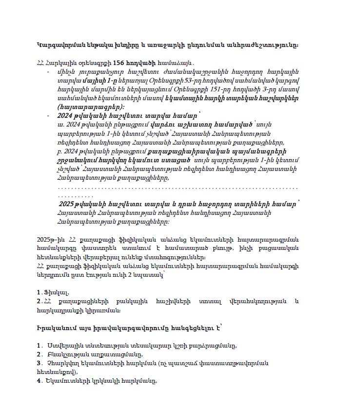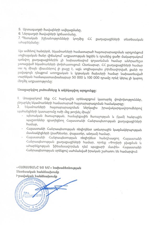 «Հայաստանը ես եմ» նախաձեռնության Տնտեսական և Իրավական հանձնախումբը պահանջում է վերանայել և չեղարկել ՀՀ քաղաքացիների եկամուտների համատարած հայտարարագրման համակարգը՝ որպես սոցիալապես անարդար և վնասաբեր լուծում։