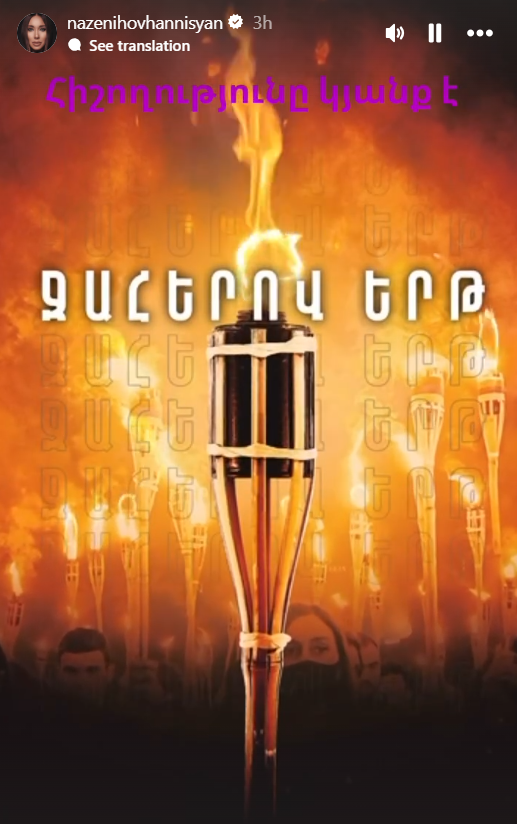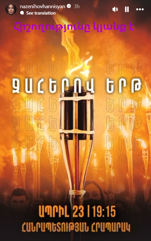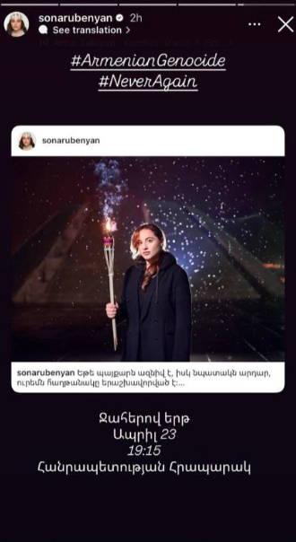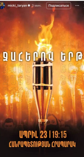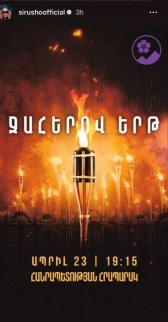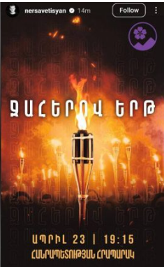 Մի շարք հայ հայտնիներ «Instagram» սոցիալական ցանցի «story» բաժնում տեղադրել են լուսանկար՝ կոչ անելով մասնակցել այսօր կայանալիք Ջահերով երթին։