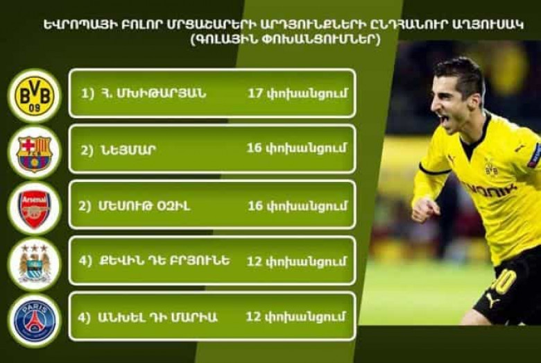 ՍՊՈՐՏԴորտմունդի «Բորուսիա»-ի և Հայաստանի ֆուտբոլի ազգային հավաքականի հարձակվողական ոճի կիսապաշտպան Հենրիխ Մխիթարյանն իր կատարած 17 գոլային փոխանցումներով գլխավորում է Եվրոպայի բոլոր մրցաշարերի արդյունքների ընդհանուր աղյուսակը: