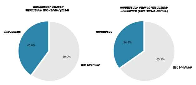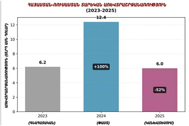 Մեր հաշվարկներով, 2025 թվականի արդյունքներով, հայ–ռուսական առևտրաշրջանառությունը կհասնի առնվազն 7 մլրդ դոլարի, ինչը զգալի անկում է նախորդ տարվա համեմատ։ Այնուամենայնիվ, Ռուսաստանը շարունակում է մնալ Հայաստանի գլխավոր առևտրային գործընկերը, որին բաժին է ընկնում մեր երկրի ամբողջ արտաքին առևտրի 34,8 տոկոսը։