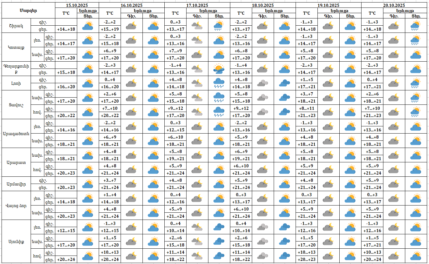Հոկտեմբերի 15-ի ցերեկը, 16-ին, 17-ի գիշերը, 18-19-ին , 20-ի գիշերը սպասվում է առանց տեղումների եղանակ։ Հոկտեմբերի 17-ի և 20-ի ցերեկն առանձին շրջաններում սպասվում է կարճատև անձրև։
