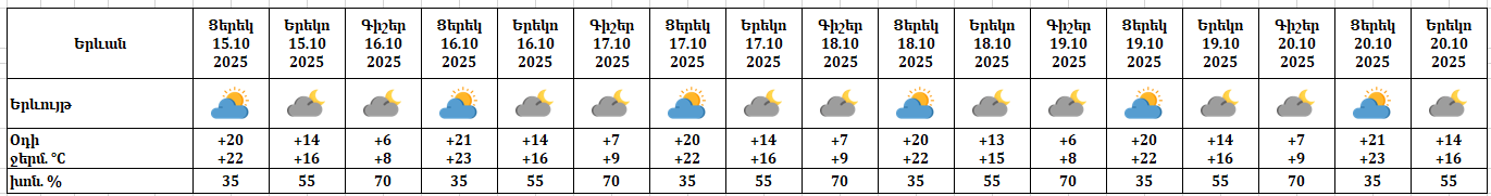 Հոկտեմբերի 15-ի ցերեկը, 16-20-ին սպասվում է առանց տեղումների եղանակ։