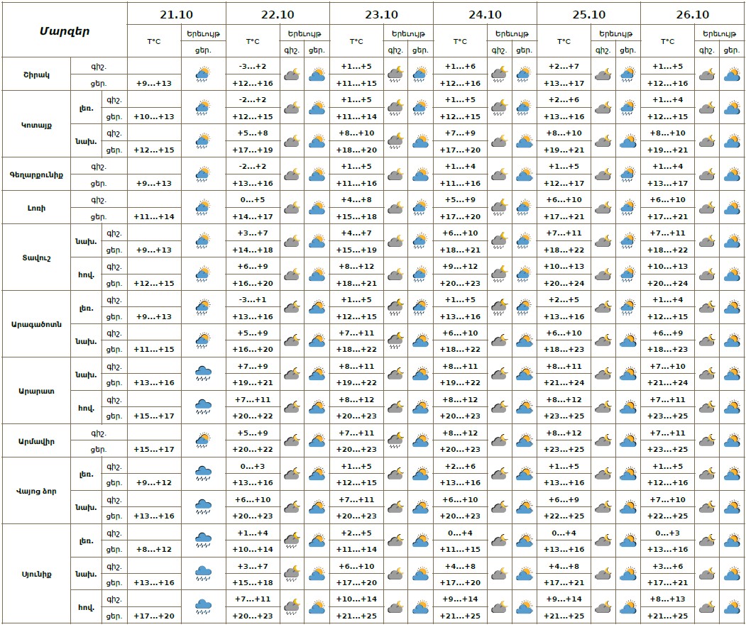 Հոկտեմբերի 21-ի ցերեկը, 23-24-ին սպասվում է կարճատև անձրև։ Հոկտեմբերի 22-ին, 25-26-ին սպասվում է առանց տեղումների եղանակ։