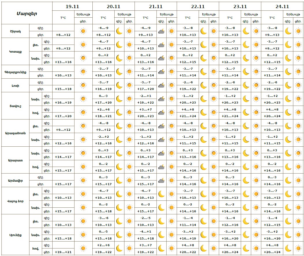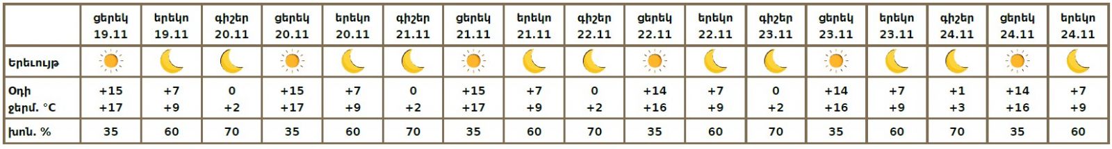Նոյեմբերի 19-ի ցերեկը, 20-24-ին սպասվում է առանց տեղումների եղանակ։