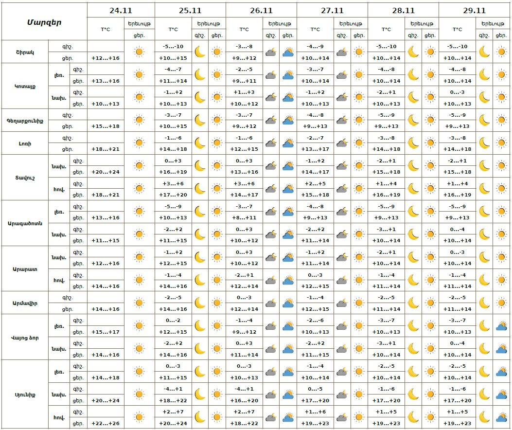 Նոյեմբերի 24-ի ցերեկը, 25-29-ին սպասվում է առանց տեղումների եղանակ։