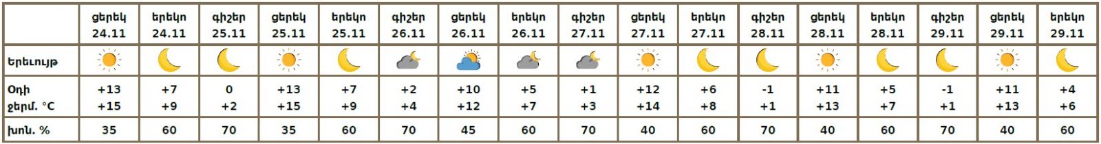 Նոյեմբերի 24-ի ցերեկը, 25-29-ին սպասվում է առանց տեղումների եղանակ, լուսադեմին Արարատյան և Շիրակի դաշտում սպասվում է կարճատև մառախուղ: Քամին հարավարևմտյան՝ 2-5մ/վ: Օդի ջերմաստիճանը նոյեմբերի 25-26-ի ցերեկն աստիճանաբար կնվազի 2-3 աստիճանով,այնուհետև էապես չի փոխվի։