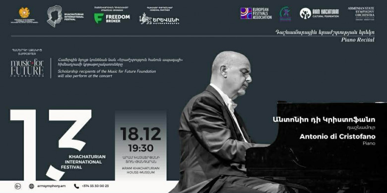 ՄՇԱԿՈՒՅԹԴեկտեմբերի 18-ին Արամ Խաչատրյանի անվան 13-րդ միջազգային փառատոնի շրջանակում Արամ Խաչատրյանի տուն-թանգարանում տեղի կունենա իտալացի դաշնակահար Անտոնիո դի Կրիստոֆանոյի մենահամերգը, որի աջակիցն է «Երաժշտություն հանուն ապագայի» հիմնադրամը: Համերգին իր ելույթներով հանդես կգան նաև «Երաժշտություն հանուն ապագայի» հիմնադրամի կրթաթոշակառուները։ Երեկոյի ընթացքում կհնչեն Ռոբերտ Շումանի Արաբեսկ դո մաժոր, երկ 18 (6 րոպե), Յոհաննես Բրամսի 4 Բալլադ, երկ 10 (22 րոպե), Ֆերենց Լիստի «Օբերմանի հովիտը» թիվ 6 մի մինոր «Ուխտագնացության տարիներ» սյուիտներից, S. 160 (14 րոպե), Ալբան Բերգի Դաշնամուրի սոնատ, երկ 1 (10 րոպե), Ֆրեդերիկ Շոպենի Պոլոնեզ թիվ 7 լյա բեմոլ մաժոր, երկ 61, «Պոլոնեզ-ֆանտազիա» (14 րոպե) ստեղծագործությունները։
