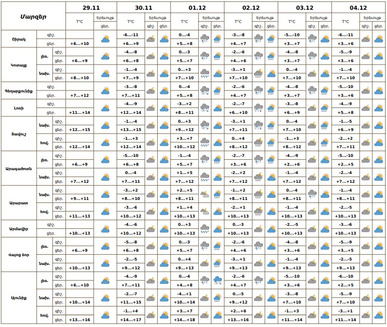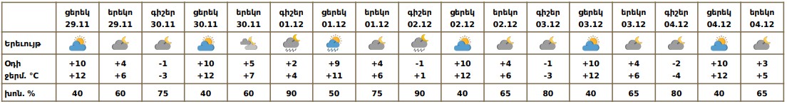Նոյեմբերի 30-ին, դեկտեմբերի 4-ին սպասվում է առանց տեղումների եղանակ։ Նոյեմբերի 30-ի լուսադեմին Արարատյան և Շիրակի դաշտում սպասվում է կարճատև մառախուղ: Դեկտեմբերի 1-3-ին առանձին շրջաններում սպասվում են տեղումներ, լեռնային շրջաններում գիշերային ժամերին ձյան և ձնախառն անձրևի, հովտային շրջաններում՝ անձրևի տեսքով: Քամին արևմտյան՝ 2-5մ/վ: Օդի ջերմաստիճանը դեկտեմբերի 1-3-ին աստիճանաբար կնվազի 3-4 աստիճանով, Արարատյան դաշտում և նրա նախալեռներում՝ էապես չի փոխվի։