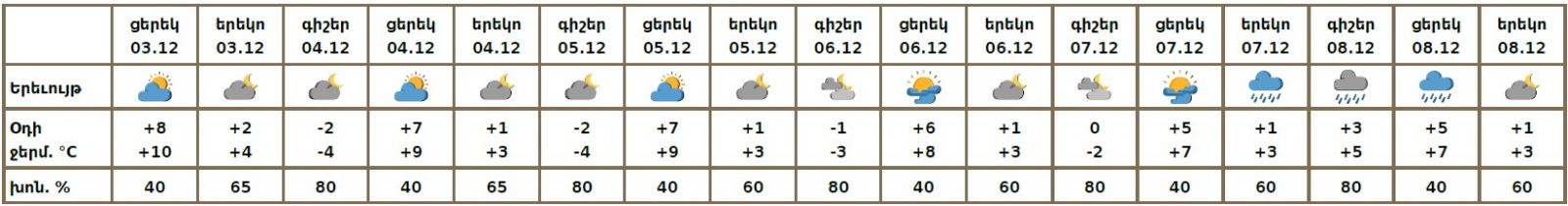 Քամին արևմտյան՝ 2-5մ/վ: Օդի ջերմաստիճանը դեկտեմբերի 7-8-ին կնվազի 2-5 աստիճանով: