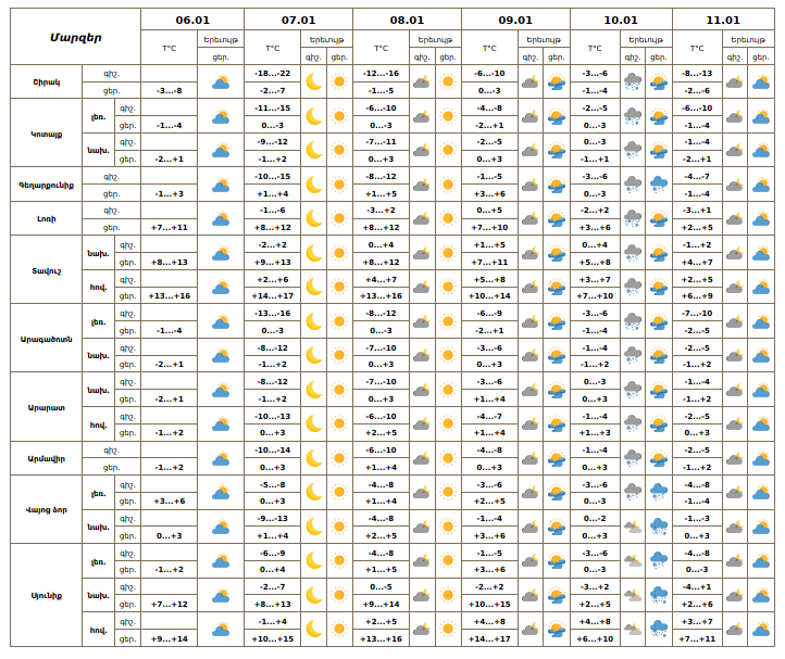 Հունվարի 6-ի ցերեկը, 7-8-ին, 9-ի գիշերը, 11-ին  սպասվում է առանց տեղումների եղանակ։ Հունվարի 9-ի ուշ երեկոյան, 10-ին առանձին շրջաններում սպասվում է ձյուն։ Քամին հյուսիսարևմտյան՝ 2-5մ/վ։  Օդի ջերմաստիճանը հունվարի 6-9-ի ցերեկը կբարձրանա 3-5, հունվարի 7-10-ի գիշերը՝  16-20,  Լոռիում, Տավուշում և Սյունիքում՝ 4-6 աստիճանով։