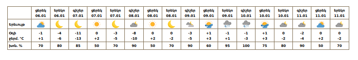 Հունվարի 6-ի ցերեկը, hունվարի 7-9-ին, 11-ին սպասվում է առանց տեղումների եղանակ: Հունվարի 9-ի ուշ երեկոյան, 10-ի գիշերը  և առավոտյան սպասվում է ձյուն: