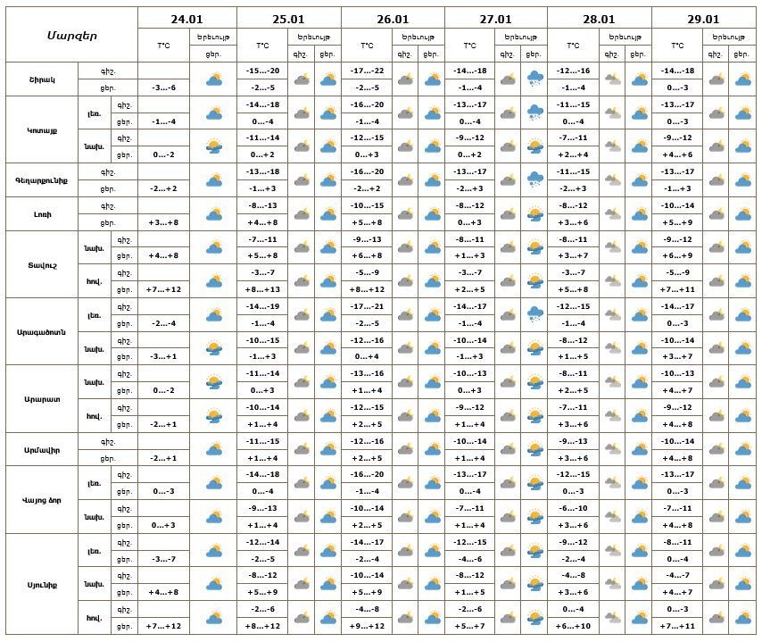 Հունվարի 24-ի ցերեկը, 25-29-ը սպասվում է առանց տեղումների եղանակ: Հունվարի 27-ի երեկոյան հնարավոր է ձյուն։