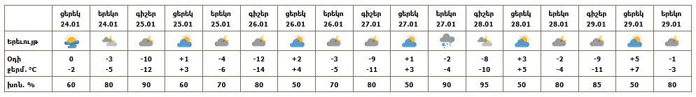 Օդի ջերմաստիճանը հունվարի 24-26-ի ցերեկային ժամերին աստիճանաբար կբարձրանա 2-5 աստիճանով: