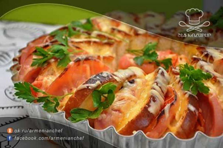 - Բատոնի շերտերի արանքում 1-ական դնել լոլիկի և խոզապուխտի կտրատված շերտերը: