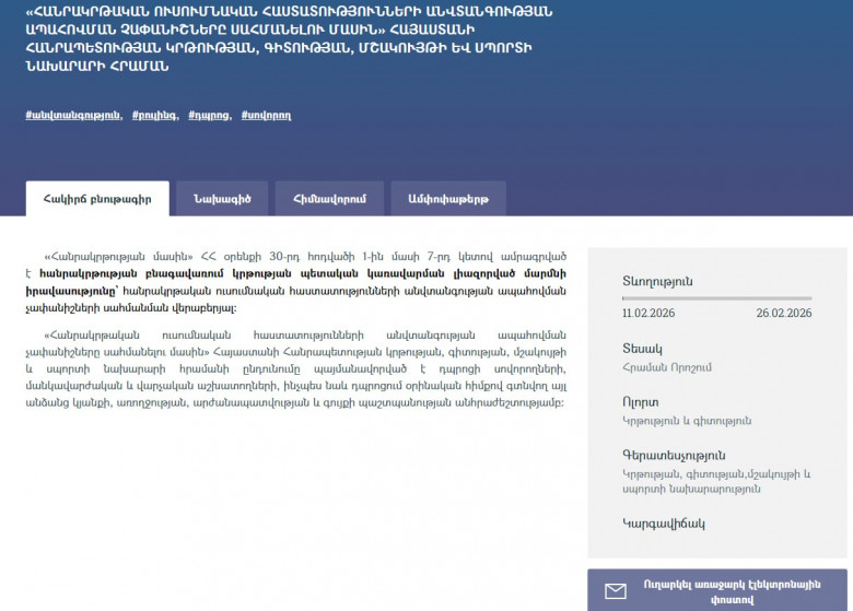 Մասնավորաբար, երեկ ԿԳՄՍ նախարարությունը հրապարակել է «Հանրակրթական ուսումնական հաստատությունների անվտանգության ապահովման չափանիշները սահմանելու մասին» նախարարի հրամանի նախագիծ: Սակայն, երբ փորձում ես ծանոթանալ բուն նախագծին, պարզվում է, որ տեղադրված է դատարկ էջ (թե՛ word, 2e՛ pdf տարբերակով), ավելի ստույգ՝ ոչ լրիվ դատարկ, պարզապես միայն նախագծի վերնագրով: Ոչ մի բառ չկա նաև «Հիմնավորում» բաժնում: Փաստացի, միակ տեղեկությունը, որ հնարավոր է ստանալ, «Հակիրճ բնութագիր» բաժնում նշվածն է, որից, բնականաբար, շատ բան չի հասկացվում: