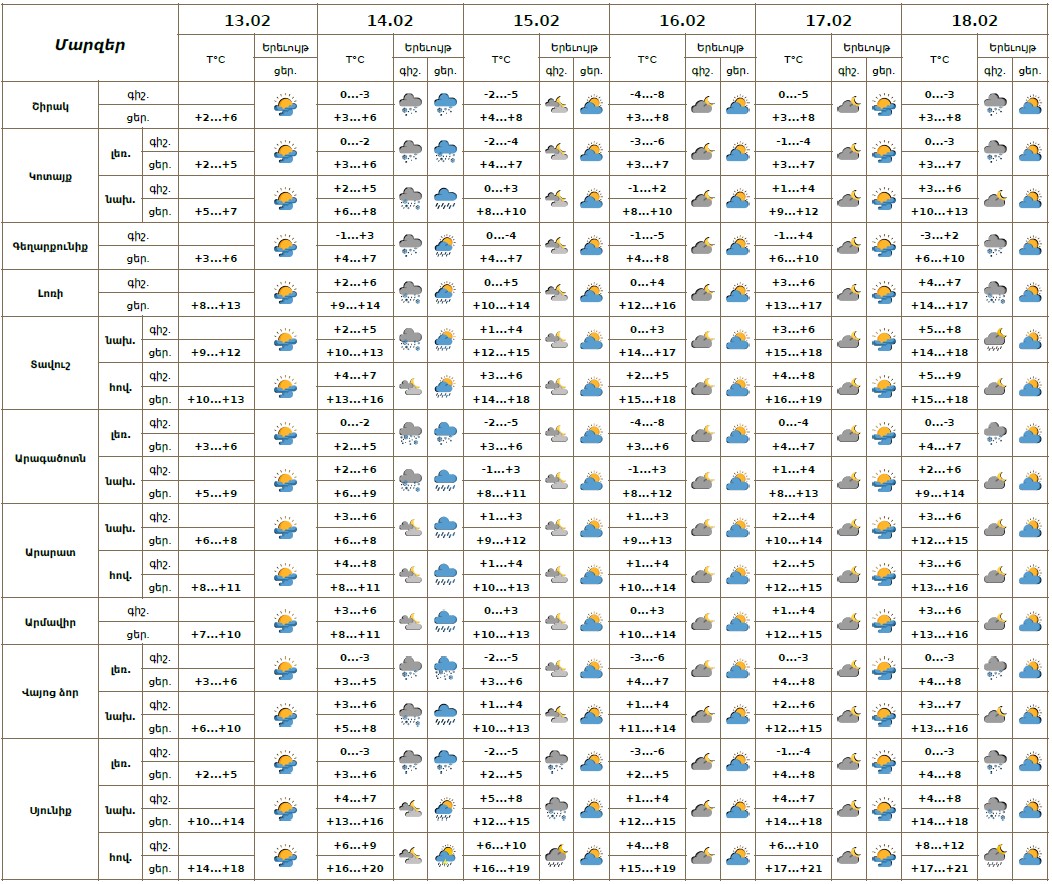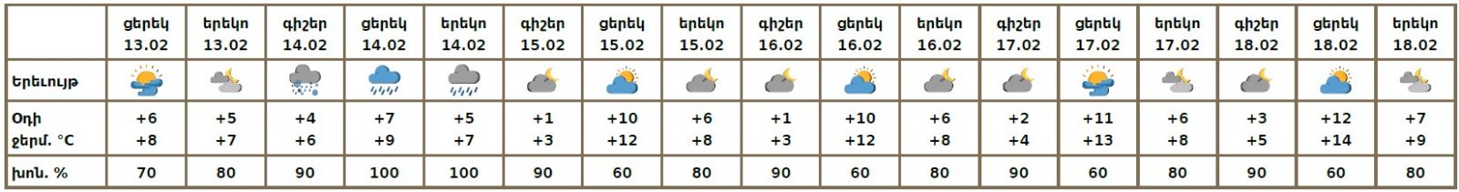 Փետրվարի 13-ի ցերեկը, 15-18-ին սպասվում է առանց տեղումների եղանակ։ Փետրվարի 14-ին սպասվում է տեղումներ․ գիշերը` անձրևի և ձնախառն անձրևի, ցերեկը՝ անձրևի տեսքով։