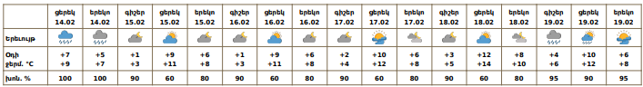 Փետրվարի 14-ի ցերեկը շրջանների զգալի մասում, 15-ի և 18-ի գիշերը, 19-ին առանձին շրջաններում սպասվում են տեղումներ․ նախալեռնային և հովտային շրջաններում՝ անձրևի և ձնախառն անձրևի, լեռնային շրջաններում՝ ձյան տեսքով։ Լեռնային առանձին շրջաններում սպասվում է նաև բուք, ցածր հորիզոնական տեսանելիություն։ Փետրվարի 15-ի ցերեկը, 16-17-ին, 18-ի ցերեկը սպասվում է առանց տեղումների եղանակ։ Քամին` հարավարևմտյան`3-6մ/վ, առանձին շրջաններում սպասվում է նաև քամու ուժգնացում․ փետրվարի 14-ի ցերեկը, 17-19-ին՝ 18-22մ/վ, 15-16-ին՝ 13-16մ/վ արագությամբ։ Օդի ջերմաստիճանը փետրվարի 14-ի ցերեկը, 15-18-ին ողջ հանրապետությունում աստիճանաբար կբարձրանա ևս 3-5 աստիճանով։