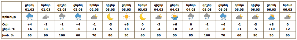 Մարտի 1-ի ցերեկը, 2-ին, 4-ի երեկոյան ժամերին, 5-ին ժամանակ առ ժամանակ սպասվում են տեղումներ․ ձյան և ձնախառն անձրևի տեսքով։ Մարտի 3-ին, 4-ի գիշերը, 6-ին սպասվում է առանց տեղումների եղանակ։