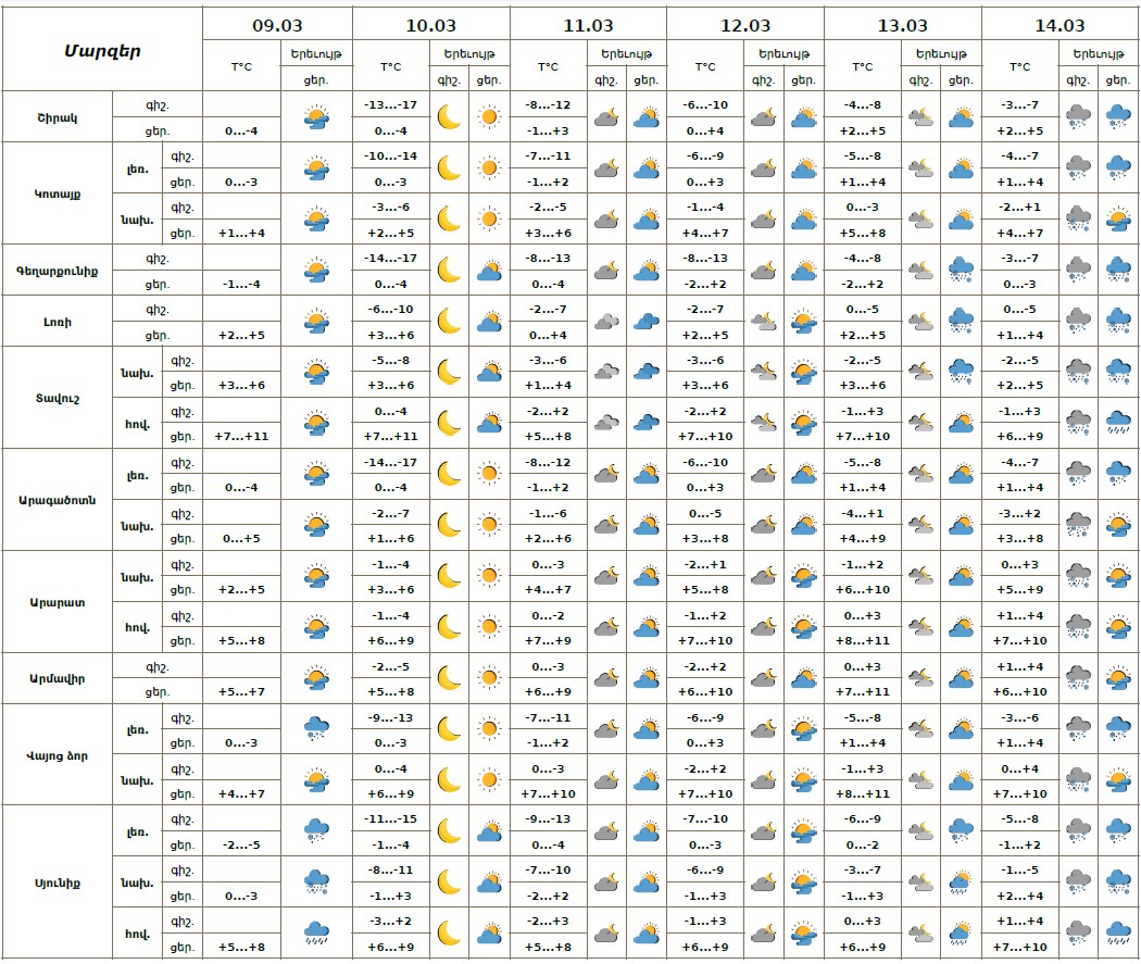 Մարտի 9-ի ցերեկը, 10-13-ին. 14-ի ցերեկը սպասվում է առանց տեղումների եղանակ։ Մարտի 14-ի գիշերը և առավոտյան ժամերին սպասվում են տեղումներ ձյան և ձնախառն անձրևի տեսքով։