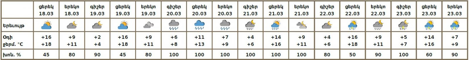 Մարտի 19-ին, 22-ի գիշերը սպասվում է առանց տեղումների եղանակ։ Մարտի 20-ին ժամանակ առ ժամանակ`շրջանների մեծ մասում, 21-ին, 22-ի ցերեկը, 23-ին առանձին շրջաններում սպասվում են տեղումներ. լեռնային գոտիներում՝ թաց ձյան, նախալեռնային և հովտային գոտիներում՝ անձրևի տեսքով։ Առանձին վայրերում հնարավոր է ամպրոպ։ Քամին`հյուսիսարևմտյան` 2-5 մ/վ։ Օդի ջերմաստիճանը էապես չի փոխվի։