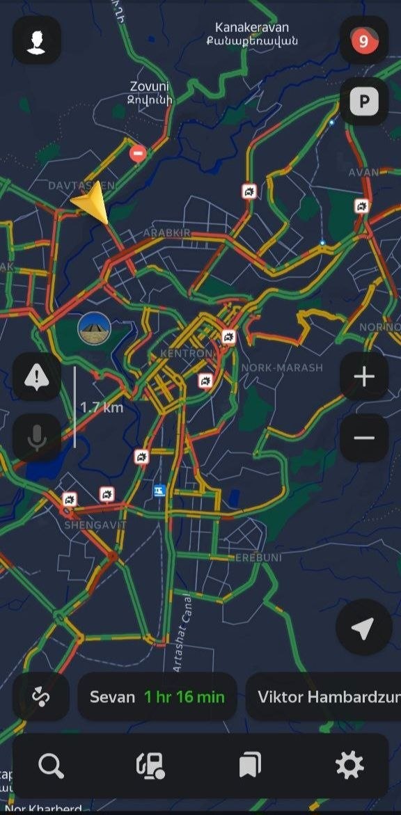 Երևանի մի շարք փողոցներում, տեղական ժամանակով, ժամը 9:00-ի դրությամբ, 9 բալանոց (երթևեկության արագությունը՝ մինչև 3 կմ/ժամ) խցանումներ են՝  ըստ Yandex Navigator-ի։